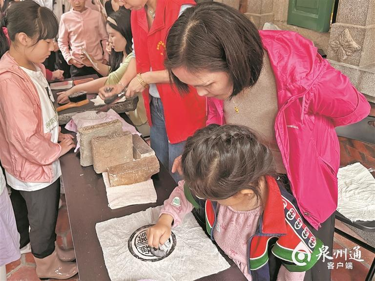 除了看展,还可以动手制作拓片。先用宣纸固定在刻件上,再用墨汁蘸上、反复拓印,最终揭下宣纸,图案就被印在纸上。“这次现场拓印活动,除了有东西塔、刺桐花等泉州元素的红砖、石雕,还有来自1700年前的青砖。这三块砖上有字或者画,比如其中有一块上面刻的是一个外国僧人画像,是那个年代泉州对外交流的重要史证。”工作人员介绍,通过体验文物拓印,不仅能了解历史文化,还能深度体会拓印在历史上的重要作用。